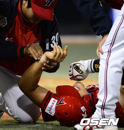 최희섭은 25일 마산 NC전에 5번 지명타자로 선발 출장해 6-1로 앞선 5회초 무사 1루서 상대 선발 아담 윌크의 4구 째 몸쪽 공에 왼손목을 강타당했다. 스윙 자세에서 손목을 그대로 투구에 직격당한 최희섭은 타석에서 얼마 떨어지지 않은 곳에 누워 극심한 고통을 호소했다.