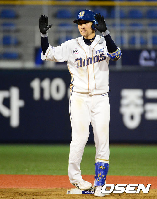 25일 오후 창원 마산야구장에서 열린 2013 한국야쿠르트 세븐프로야구 NC 다이노스와 KIA 타이거즈의 경기, 6회말 1사 2,3루에서 NC 이상호가 우전 2타점 적시 2루타를 치고 타임을 외치고 있다.