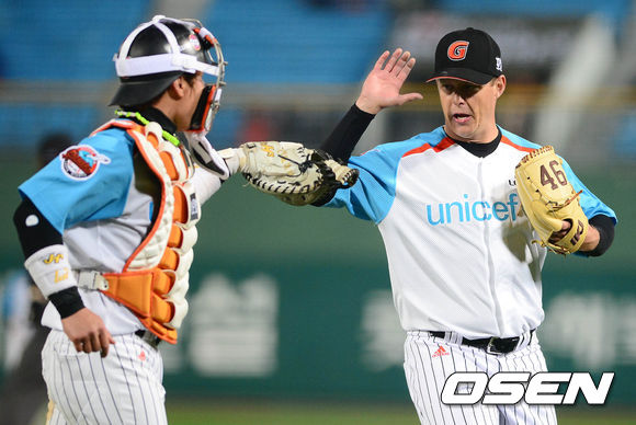 25일 오후 부산 사직구장에서 열린 '2013 한국야쿠르트 세븐 프로야구' 롯데 자이언츠와 SK 와이번스의 경기 7회초를 마친 옥스프링이 덕아웃으로 향하며 용덕한과 하이파이브를 하고 있다.