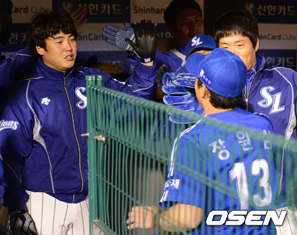 25일 오후 서울 잠실야구장에서 열린 '2013 한국야쿠르트 세븐 프로야구' LG 트윈스와 삼성 라이온스의 경기, 7회말 수비를 마친 삼성 장원삼이 동료선수들과 더그아웃에서 하이파이브를 하고 있다.