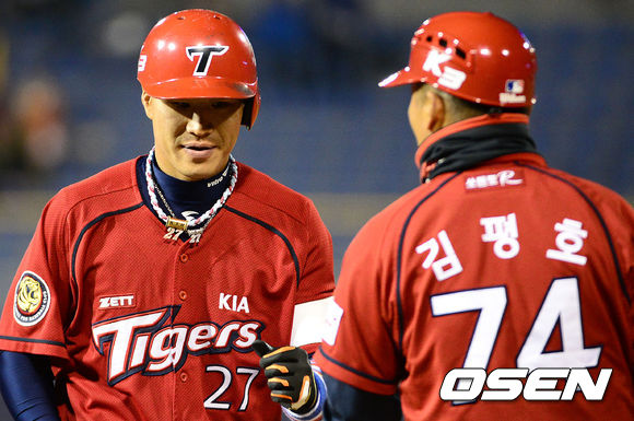 25일 오후 창원 마산야구장에서 열린 2013 한국야쿠르트 세븐프로야구 NC 다이노스와 KIA 타이거즈의 경기, 7회초 무사 1,3루에서 KIA 김상현이 좌전 적시타를 치고 김평호 코치와 하이파이브를 하고 있다.