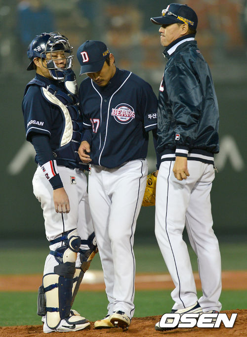 25일 오후 서울 목동구장에서 '2013 한국야쿠르트 세븐 프로야구' 넥센 히어로즈 대 두산 베어스의 경기가 열렸다. 6회말 넥센 공격 선두타자로 나선 4번 박병호에게 중견수 키를 넘기는 2루타를 허용한 두산 선발 김상현이 마운드를 내려가고 있다.