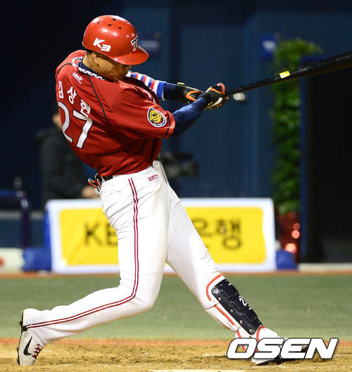 25일 오후 창원 마산야구장에서 열린 2013 한국야쿠르트 세븐프로야구 NC 다이노스와 KIA 타이거즈의 경기, 7회초 무사 1,3루에서 KIA 김상현이 좌전 안타를 치고 있다.