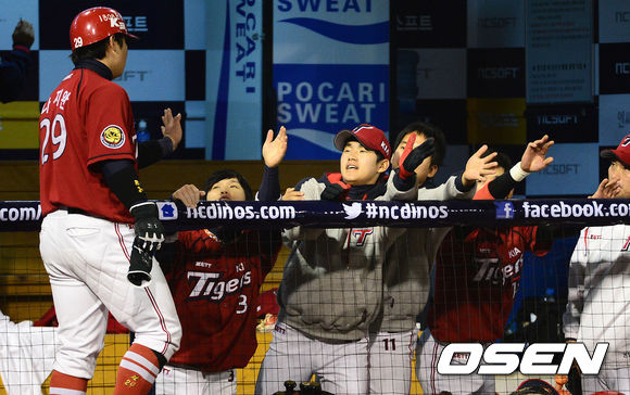 25일 오후 창원 마산야구장에서 열린 2013 한국야쿠르트 세븐프로야구 NC 다이노스와 KIA 타이거즈의 경기, 7회초 무사 1,3루에서 KIA 김상현의 좌전 적시타 떄 홈을 밟은 3루주자 나지완이 덕아웃에서 동료들의 축하를 받고 있다.