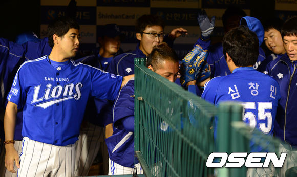 25일 오후 서울 잠실야구장에서 열린 '2013 한국야쿠르트 세븐 프로야구' LG 트윈스와 삼성 라이온스의 경기, 8회말 1사 1루에서 마운드를 내려간 삼성 선발 장원삼이 무실점으로 위기를 넘긴 심창민과 하이파이브를 하고 있다.
