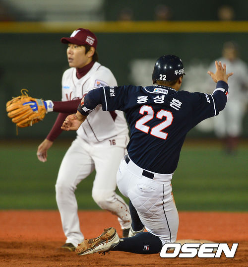 25일 오후 서울 목동구장에서 '2013 한국야쿠르트 세븐 프로야구' 넥센 히어로즈 대 두산 베어스의 경기가 열렸다. 7회초 두산 공격 2사 1루 상황 주자 홍성흔이 2루 도루에 성공하고 있다.