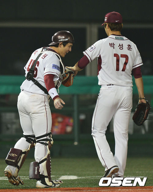 25일 오후 서울 목동구장에서 '2013 한국야쿠르트 세븐 프로야구' 넥센 히어로즈 대 두산 베어스의 경기가 열렸다. 7회초 넥센 공격 2사 3루 상황에서 6번 오재원을 삼진으로 이끌며 무실점으로 이닝을 마무리 지은 넥센 투수 박성훈과 포수 박동원이 인사를 나누고 있다.