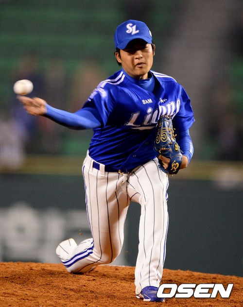 25일 오후 서울 잠실야구장에서 열린 '2013 한국야쿠르트 세븐 프로야구' LG 트윈스와 삼성 라이온스의 경기, 8회말 1사 1루에서 삼성 심창민이 마운드에 올라 역투하고 있다.