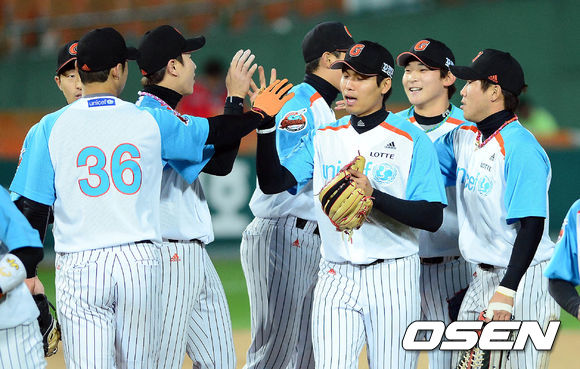 25일 오후 부산 사직구장에서 열린 '2013 한국야쿠르트 세븐 프로야구' 롯데 자이언츠와 SK 와이번스의 경기 종료 후 롯데 선수들이 하이파이브를 하고 있다.