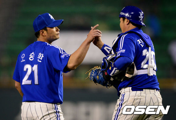 경기후 삼성 오승환과 진갑용이 승리 세리머니를 하고 있다./jpnews@osen.co.kr