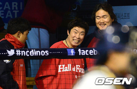 25일 오후 창원 마산야구장에서 열린 2013 한국야쿠르트 세븐프로야구 NC 다이노스와 KIA 타이거즈의 경기, 9회초 KIA 최희섭이 덕아웃에서 동료들과 이야기를 나누고 있다. 5회초 무사에서 NC 아담의 투구에 맞아 교체된 최희섭은 인근 병원에서 진단 결과 단순 타박상으로 판명 됐다.