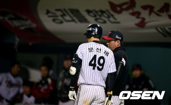 9회말 무사 1루에서 LG 김기태 감독이 타석에 들어 선 문선재를 불러 이야기를 나누고 있다./jpnews@osen.co.kr