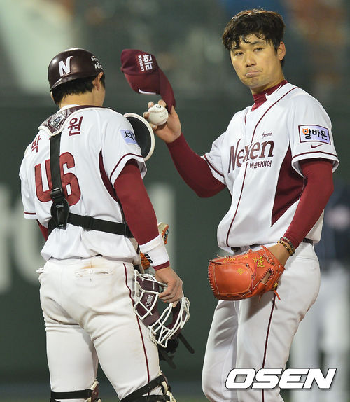 25일 오후 서울 목동구장에서 '2013 한국야쿠르트 세븐 프로야구' 넥센 히어로즈 대 두산 베어스의 경기가 열렸다. 연장 10회초 2사 만루 상황 1번 이종욱에게 2타점 적시타를 허용한 넥센 마무리투수 손승락이 모자를 벗으며 아쉬운 표정을 짓고 있다.