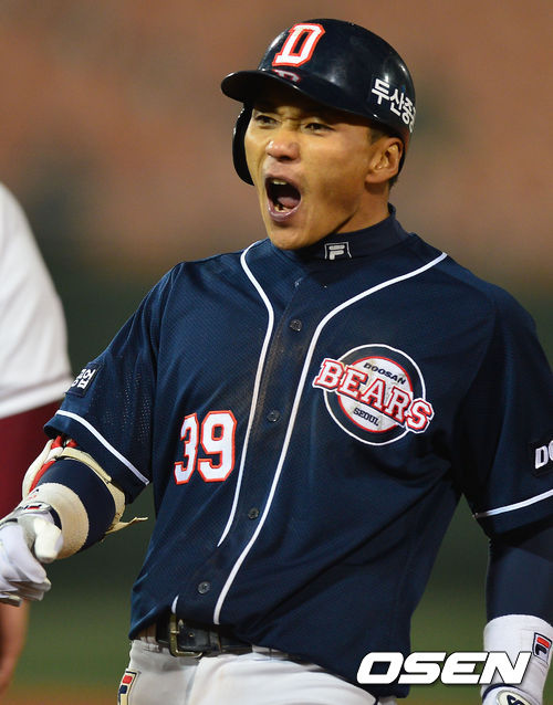 25일 오후 서울 목동구장에서 '2013 한국야쿠르트 세븐 프로야구' 넥센 히어로즈 대 두산 베어스의 경기가 열렸다. 연장 10회초 두산 공격 2사 만루 상황 1번 이종욱이 넥센 마무리투수 손승락을 상대로 2타점 적시타를 날리고 환호하고 있다.