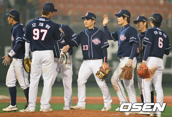 25일 오후 서울 목동구장에서 '2013 한국야쿠르트 세븐 프로야구' 넥센 히어로즈 대 두산 베어스의 경기가 열렸다. 원정팀 두산이 홈팀 넥센을 6-3으로 꺾고 승리를 거뒀다. 승리한 두산 선수들이 마운드에서 하이파이브를 나누고 있다.