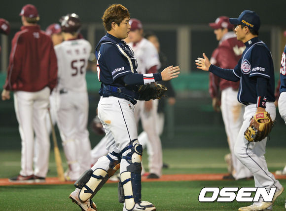 25일 오후 서울 목동구장에서 '2013 한국야쿠르트 세븐 프로야구' 넥센 히어로즈 대 두산 베어스의 경기가 열렸다. 원정팀 두산이 홈팀 넥센을 6-3으로 꺾고 승리를 거뒀다. 승리한 두산 선수들이 인사를 나누고 있다.