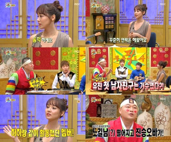 유진은 25일 방송된 MBC 예능프로그램 '황금어장-무릎팍도사(이하 '무릎팍')'에서 "내 첫사랑은 가수였다"고 말했다.
