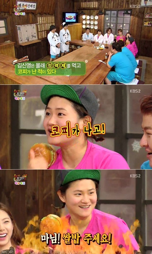 25일 오후 방송된 KBS2 '해피투게더3'에 출연한 김신영은 먹는 것과 관련된 다양한 에피소드를 털어놔 웃음을 자아냈다. 특히 먹는 것에 집착하던 어린시절 "어머니가 찬장에 숨겨놓은 정력제를 먹고 코피를 흘렸던 적이 있다"고 밝혔다.