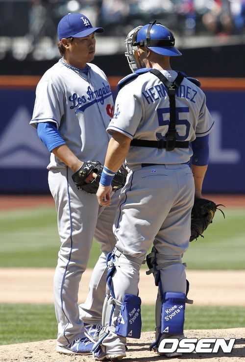 5회말 2사 류현진이 에르난데스 포수와 이야기를 나누고 있다. /photo@osen.co.kr