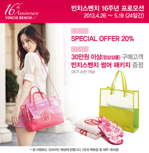 4월 26일부터 5월 19일까지 24일간 진행 되는 ‘빈치스벤치 16주년 프로모션’은 전국 빈치스벤치 매장에서 정상 상품을 20% 할인된 가격에 만나 볼 수 있게 한다.