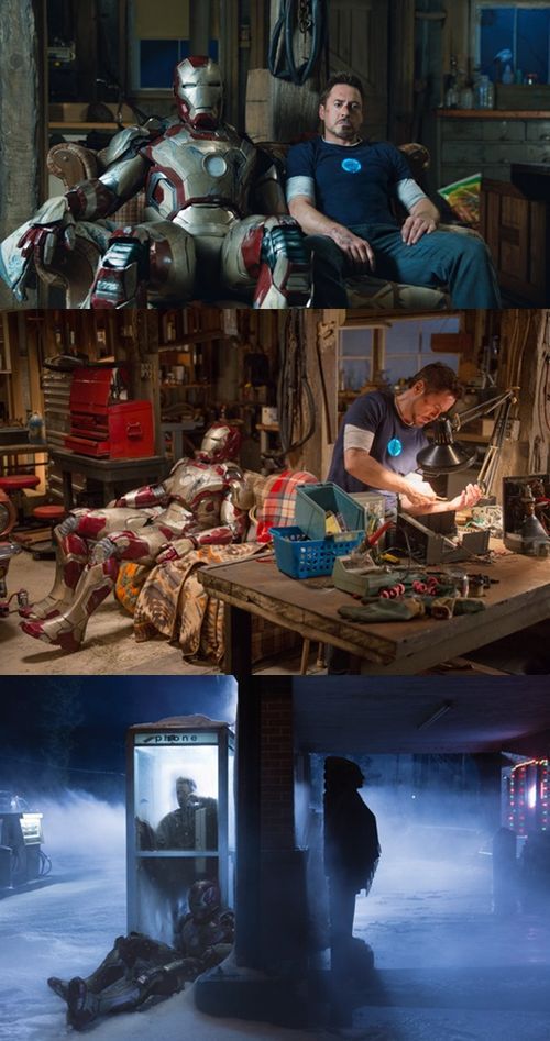 스틸 속에서 마치 망연자실한 채 바닥에 철퍼덕 앉아 있거나, 소파 위에 편하게 자리 잡은 것처럼 보이는 아이언맨 슈트는 사실 텅 비어있는 상태.