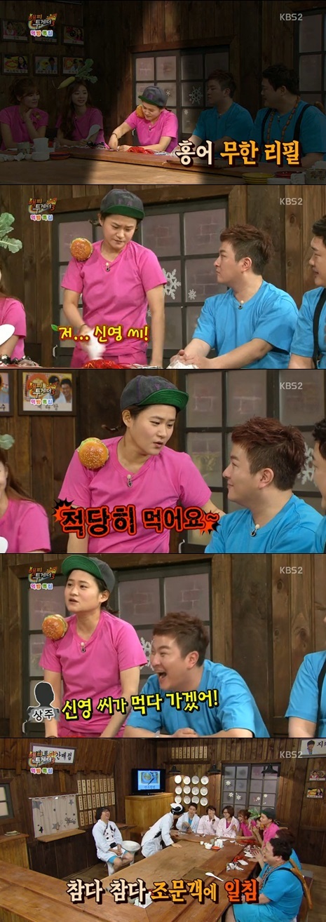 결국 유족 중 한 명이 김신영에게 일침을 날렸다. 김신영은 “멀리서 계시던 어머니가 나에게 다가오시더니 ‘신영 씨, 적당히 먹어라. 그러다 신영 씨가 먹다 가겠어’라고 말했다”며 “정말 민망하더라. 그래서 죄송하다고 사과했다”고 말해 웃음을 자아냈다.
