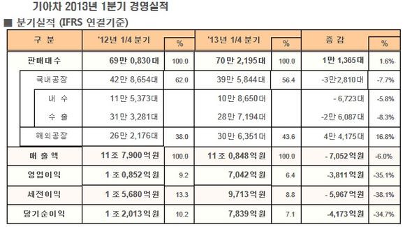 기아자동차의 2013년 1분기 매출과 영업이익이 모두 줄었다.