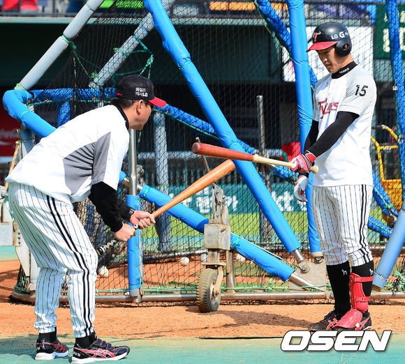 26일 오후 서울 잠실구장에서 열리는 '2013 한국야쿠르트 세븐 프로야구' LG 트윈스와 롯데 자이언츠의 경기 시작 전 김기태 감독이 정주현의 훈련을 돕고 있다.