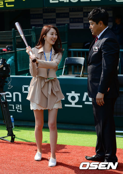 26일 오후 서울 잠실구장에서 열리는 '2013 한국야쿠르트 세븐 프로야구' LG 트윈스와 롯데 자이언츠의 경기 시작 전 김세희 아나운서가 방망이를 들고 타격 자세를 취하고 있다.
