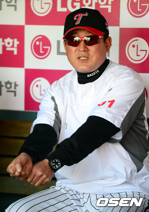 26일 오후 서울 잠실구장에서 열리는 '2013 한국야쿠르트 세븐 프로야구' LG 트윈스와 롯데 자이언츠의 경기 시작 전 김기태 감독이 취재진들과 이야기를 나누고 있다.