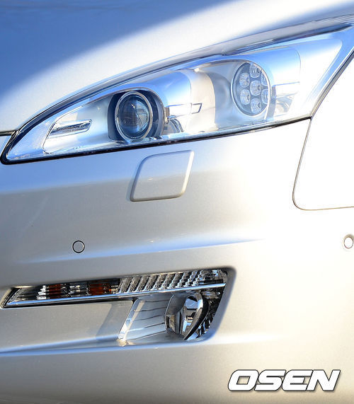 푸조 '뉴 508' 헤드라이터, 크로 장식이 없음에도 불구하고 라인 처리로 인해 빛이 반사될 때 크롬장식이 있는 듯한 착각을 일으켜 화려해 보이는 효과가 있다.