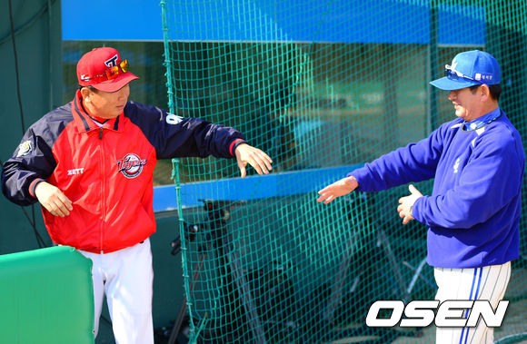 26일 오후 광주 무등구장에서 열리는 '2013 한국야쿠르트 세븐 프로야구' KIA 타이거즈와 삼성 라이온즈의 경기에 앞서 KIA 선동렬 감독과 삼성 류중일 감독이 악수를 나누고 있다