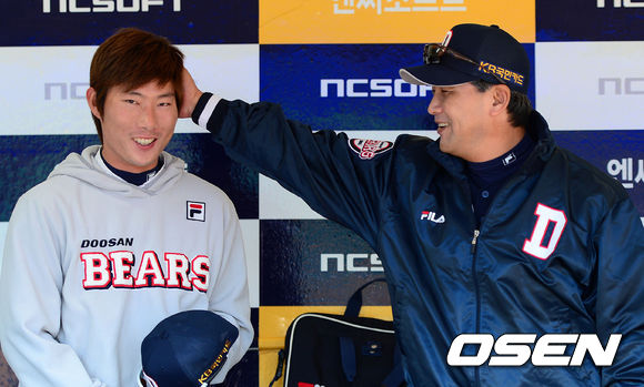 26일 오후 창원 마산야구장에서 열린 2013 한국야쿠르트 세븐프로야구 NC 다이노스와 두산 베어스의 경기, 경기에 앞서 두산 김진욱 감독이 고영민과 이야기를 나누며 머리를 쓰다듬고 있다.