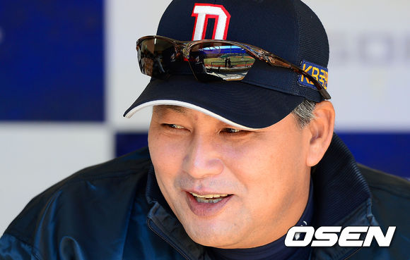 26일 오후 창원 마산야구장에서 열린 2013 한국야쿠르트 세븐프로야구 NC 다이노스와 두산 베어스의 경기, 경기에 앞서 두산 김진욱 감독이 선수들과 인사를 나누며 미소를 짓고 있다.