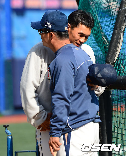 26일 오후 창원 마산야구장에서 열린 2013 한국야쿠르트 세븐프로야구 NC 다이노스와 두산 베어스의 경기, 경기에 앞서 두산 이종욱이 NC 김광림 코치와 인사를 나누고 있다.