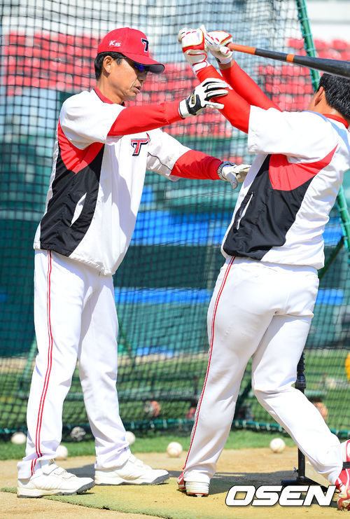 26일 오후 광주 무등구장에서 열리는 '2013 한국야쿠르트 세븐 프로야구' KIA 타이거즈와 삼성 라이온즈의 경기에 앞서 KIA 김용달 코치가 김상훈의 타격 자세를 교정하고 있다