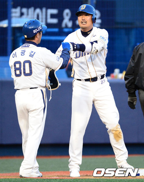 26일 오후 창원 마산야구장에서 열린 2013 한국야쿠르트 세븐프로야구 NC 다이노스와 두산 베어스의 경기, 1회말 2사 3루에서 NC 이호준이 좌전 적시 2루타를 치고 2루에서 공이 빠진 틈을 타 3루로 쇄도해 세이프 되고 있다.