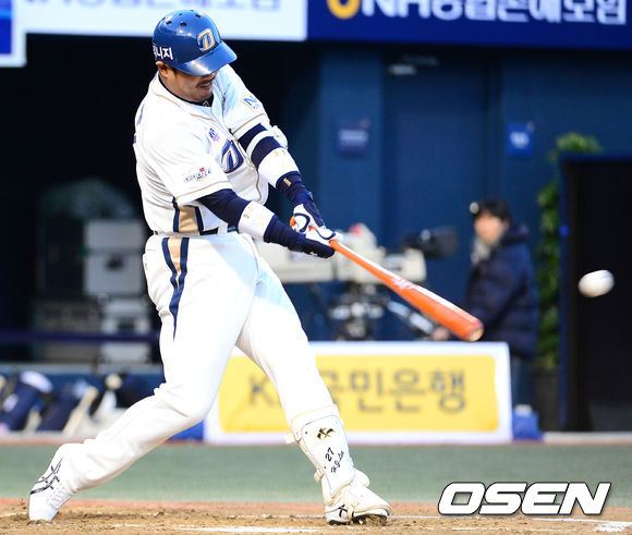 26일 오후 창원 마산야구장에서 열린 2013 한국야쿠르트 세븐프로야구 NC 다이노스와 두산 베어스의 경기, 1회말 2사 3루에서 NC 이호준이 좌전 적시 2루타를 치고 있다.