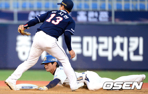 26일 오후 창원 마산야구장에서 열린 2013 한국야쿠르트 세븐프로야구 NC 다이노스와 두산 베어스의 경기, 1회말 무사 1루에서 NC 차화준 타석 때 1루주자 김종호가 도루에 성공하고 있다.