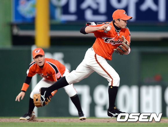 26일 오후 인천 문학야구장에서 열린 2013 한국야쿠르트 세븐프로야구 SK 와이번스와 한화 이글스의 경기, 2회말 무사 1루 한화 오선진이 SK 조성우의 타구를 잡아 2루로 송구하려 하고 있다.