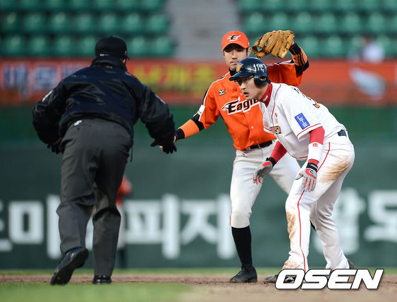 26일 오후 인천 문학야구장에서 열린 2013 한국야쿠르트 세븐프로야구 SK 와이번스와 한화 이글스의 경기, 2회말 2사 1루 SK 조성우가 2루 도루를 성공한 뒤 심판의 판정을 바라보고 있다.