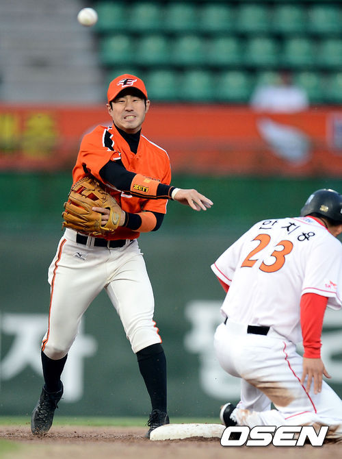 26일 오후 인천 문학야구장에서 열린 2013 한국야쿠르트 세븐프로야구 SK 와이번스와 한화 이글스의 경기, 2회말 무사 1루 한화 한상훈이 1루주자 안치용을 포스아웃으로 잡아내고 타자주자 조성우를 잡기위해 1루로 송구하고 있다. 결과는 1루 세이프.