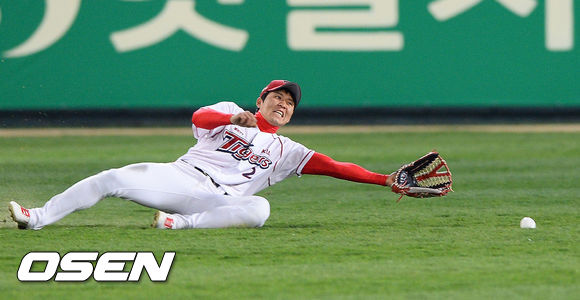 26일 오후 광주 무등구장에서 열린 '2013 한국야쿠르트 세븐 프로야구' KIA 타이거즈와 삼성 라이온즈의 경기, 5회초 2사 삼성 이지영의 좌익수 앞 떨어지는 안타때 KIA 신종길 좌익수가 타구를 놓치고 있다