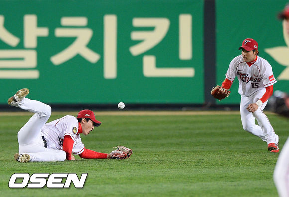 26일 오후 광주 무등구장에서 열린 '2013 한국야쿠르트 세븐 프로야구' KIA 타이거즈와 삼성 라이온즈의 경기, 5회초 2사 삼성 이지영의 좌익수 앞 떨어지는 안타때 KIA 신종길 좌익수가 타구를 놓치고 있다