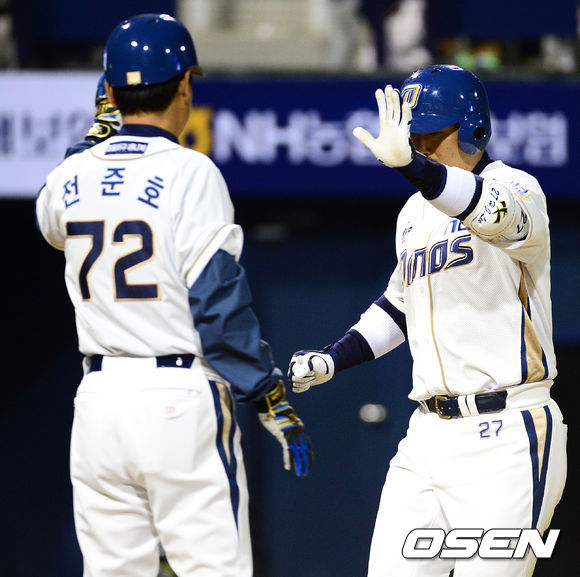 26일 오후 창원 마산야구장에서 열린 2013 한국야쿠르트 세븐프로야구 NC 다이노스와 두산 베어스의 경기, 4회말 무사에서 NC 이호준이 중월 솔로 홈런을 치고 홈에서 전준호 코치와 하이파이브를 하고 있다.