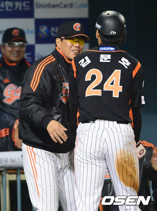 26일 오후 서울 잠실구장에서 열린 '2013 한국야쿠르트 세븐 프로야구' LG 트윈스와 롯데 자이언츠의 경기 5회초 2사 2루 손아섭의 1타점 적시타에 홈을 밟은 김문호가 김시진 감독의 격려를 받고 있다.