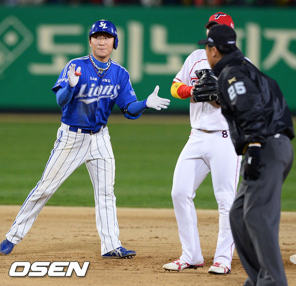 26일 오후 광주 무등구장에서 열린 '2013 한국야쿠르트 세븐 프로야구' KIA 타이거즈와 삼성 라이온즈의 경기, 5회초 2사 2루 삼성 배영섭이 선취 1타점 적시타를 날리고 박수를 치고 있다.