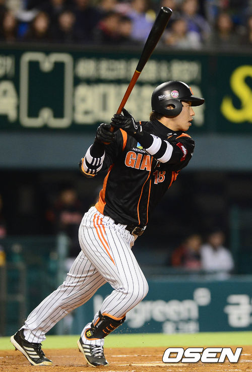 26일 오후 서울 잠실구장에서 열린 '2013 한국야쿠르트 세븐 프로야구' LG 트윈스와 롯데 자이언츠의 경기 5회초 2사 2루 김대우가 1타점 적시타를 치고 있다.