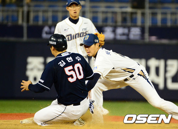 26일 오후 창원 마산야구장에서 열린 2013 한국야쿠르트 세븐프로야구 NC 다이노스와 두산 베어스의 경기, 5회초 1사 1루에서 두산 오재원의 삼진 때 도루를 시도한 1루주자 김현수가 NC 차화준에게 태그아웃을 당하고 있다.