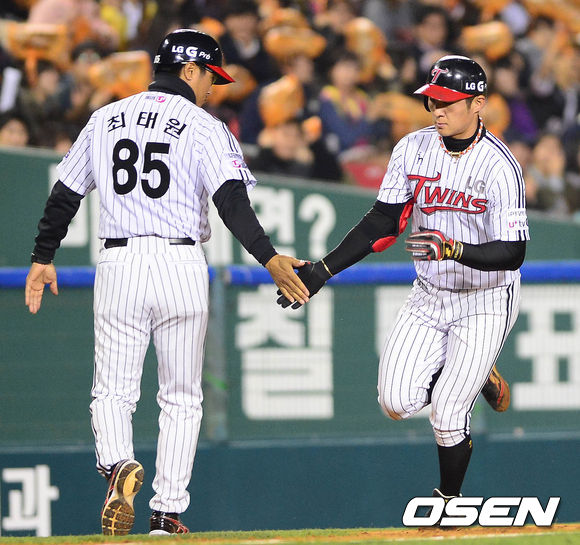 26일 오후 서울 잠실구장에서 열린 '2013 한국야쿠르트 세븐 프로야구' LG 트윈스와 롯데 자이언츠의 경기 5회말 1사 오지환이 솔로포를 친 후 최태원 코치와 하이파이브를 하고 있다.